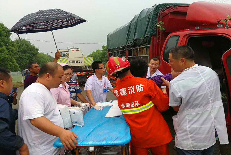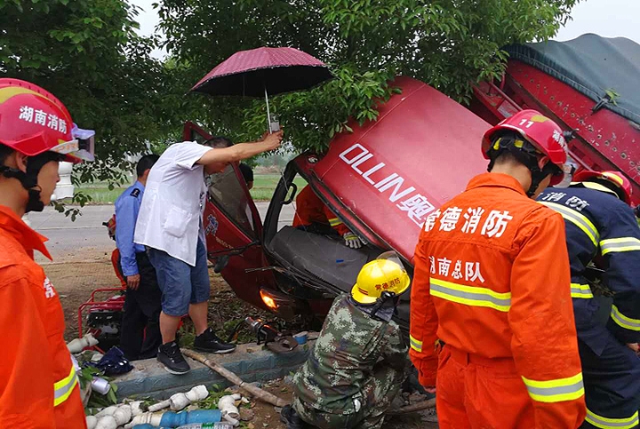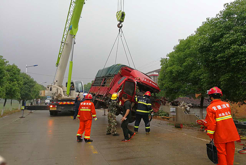正在大家万分焦急之时,接到报警的县消防大队官兵赶到了现场。到达事故现场后,来不及喘口气,消防官兵马上和交警一道,冒着风雨投入营救行动。消防官兵利用抢险救援车车头的牵引器拉扯变形的驾驶室,使用多功能钳将挤压变形车门剪开;用液压工具组将卡住司机左腿部分空间进行扩张……经过1个多小时努力,终于将变形的驾驶仓解体,成功将受伤男子从夹缝中救出。等候已久的医护人员迅速将受伤司机抬上救护车送往常德市某医院抢救。