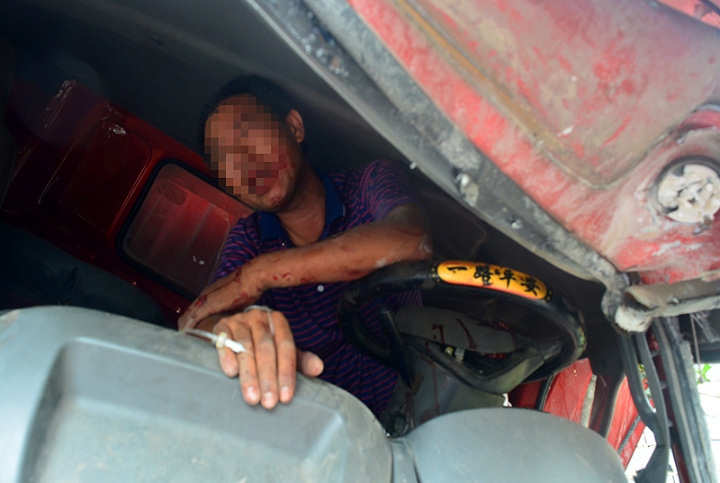 民警第一时间电话通知了距离事故现场最近的白洋湖医院出动救护车抢救伤者,并报告当地政府和石门县消防大队紧急赶往救援。民警在最短的时间内,急速赶到4公里外的事故现场。民警经现场了解,石门县籍驾驶员王某平驾驶湘J6J**9号轻型仓栅式货车拉载西瓜自常德市出发返回石门县城。于当日14时40分许,行至石门县蒙泉镇保宁桥村路段时,因车辆失控连续撞断道路左侧三棵树之后,又撞上周围民居围墙发生侧翻。货车经撞击后,车头严重变形,驾驶人王某平左腿和部分躯干被死死的卡在车内不能动弹,伤者伤痕遍身,痛苦不堪,鲜血沾满了座仓,情形相当危急。