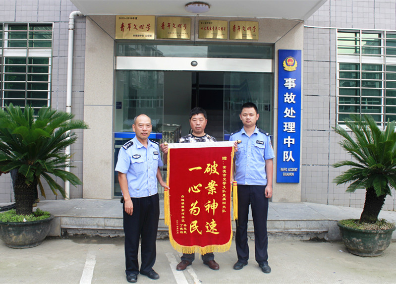 6月20日上午,家住常德白鹤镇郑家桥社区的杨军民怀着感恩的心来到常德交警直属四大队,将一面写有“破案神速,一心为民”的锦旗交到了“5.20”重大交通肇事逃逸案办案民警周正国的手中,以此表达全家人的感激之情。