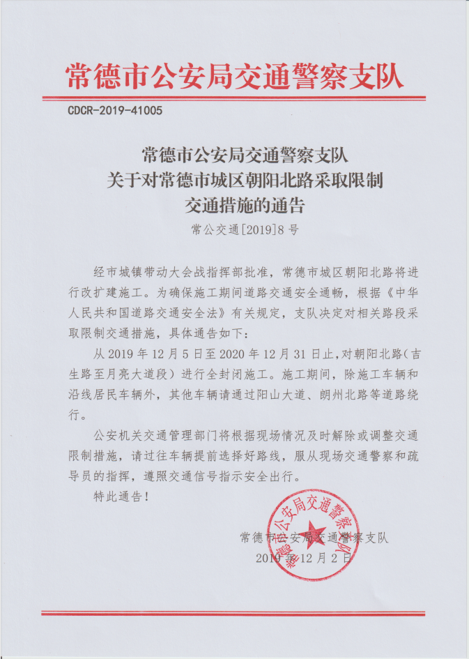 常德市公安局交通警察支队关于对常德市城区朝阳北路采取限制交通措施的通告