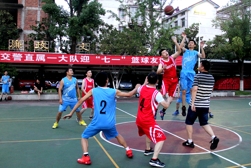 为迎接中国共产党诞辰96周年,更好的开展优秀团队创建活动,活跃警营文化生活,构建警营和谐关系,增强队伍凝注力,达到健身强体和促进工作目的,大队“迎七一”创建优秀团队篮球赛自6月28日晚开始正式比赛。因为天气和整治行动勤务安排原因,随后的几场比赛在休息时间陆续举行。赛场上,球员们迎难而上、顽强蛮拼、观众助威呐喊、相互支持,体现了“友谊第一,比赛第二;团队第一,个人第二”良好精神风貌。