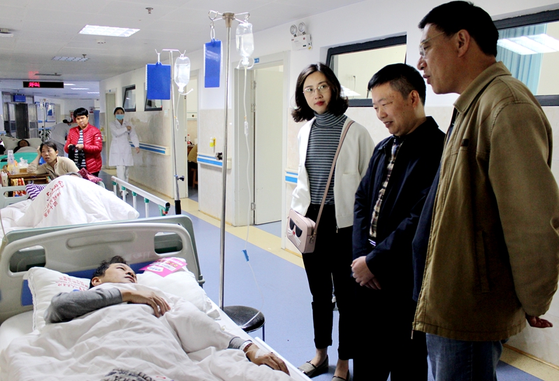 在医院,刘元春一行详细询问了邓志鸿的病情,请他安心养病,并代表支队党委送上了慰问金。刘元春还嘱咐身边的大队领导一定要照顾关心好民警住院期间的生活,协调安排好治疗。同时,请邓志鸿的家属放心,有什么问题及时向组织反映,祝福邓志鸿早日康复。