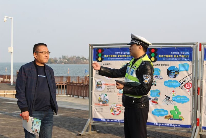 活动中,针对辖区旅游交通特点,大队民警在景区内车辆聚地带和人流量汇集场所,通过摆放交通安全宣传展板、发放发传单、与广大交通参与者进行面对面的交谈等多形式,向景区游客、商铺、群众普及相关交通安全法律知识,告知礼让斑马线安全通行的具体规则,告诫驾交通参与者超速、超员、酒后驾驶、无证无牌机动车上路、车辆不按规定缴纳交强险各类交通违章行为危害性等,倡导广大出游群众自觉遵守交通安全法律法规,抵制交通违法行为,不忘交通安全,文明出行。同时,温馨提示景区游玩的群众进入冬季路面易结冰,雨雾天气路面湿滑,能见度低,驾驶员朋友要控制好车速,谨慎驾驶,避免交通事故的发生。