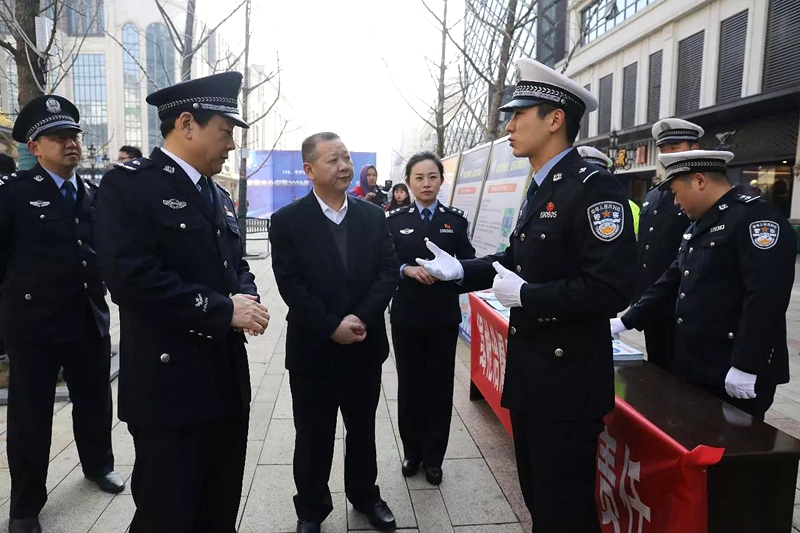 1月10日上午,市公安局在武陵阁步行城开展了以“110,守护新时代美好生活”为主题的集中宣传活动,迎接全国第32个“110宣传日”的到来,宣传我市110接处警工作和成果。市人民政府副市长、市公安局局长李忠,市公安局党委副书记、常务副局长胡文出席活动。交警支队设置交通安全宣传咨询台,民警现场以案说法,积极参与活动,助力新时代美好生活平安出行。