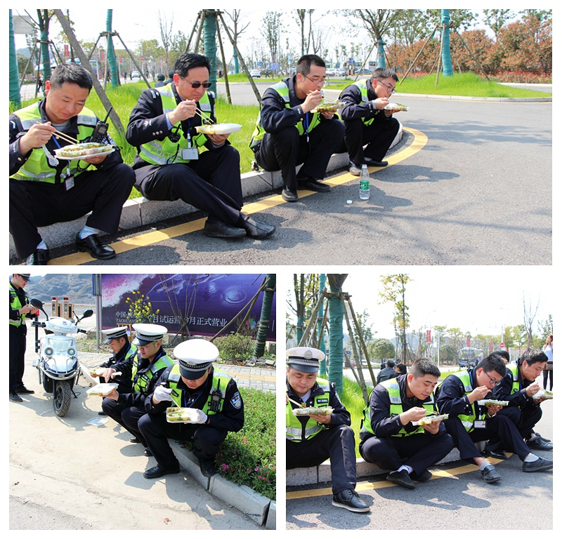 由于当天交通流量大,保畅任务重,民警、协警们一直在路上保驾护航,顾不上喝上一口水,吃上一口热饭。直到下午1点多,路面车流渐渐少了,他们才在执勤的路边上,和着暖风,夹着灰尘和汽车尾气,快速地吃了一顿“午餐”,然后又继续投入到工作中。这群默默的道路平安守护者,用他们的忠诚和担当,守护着活动的欢乐祥和,守护着岁月的花好月圆。