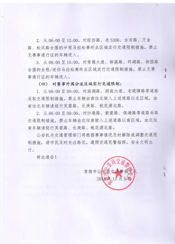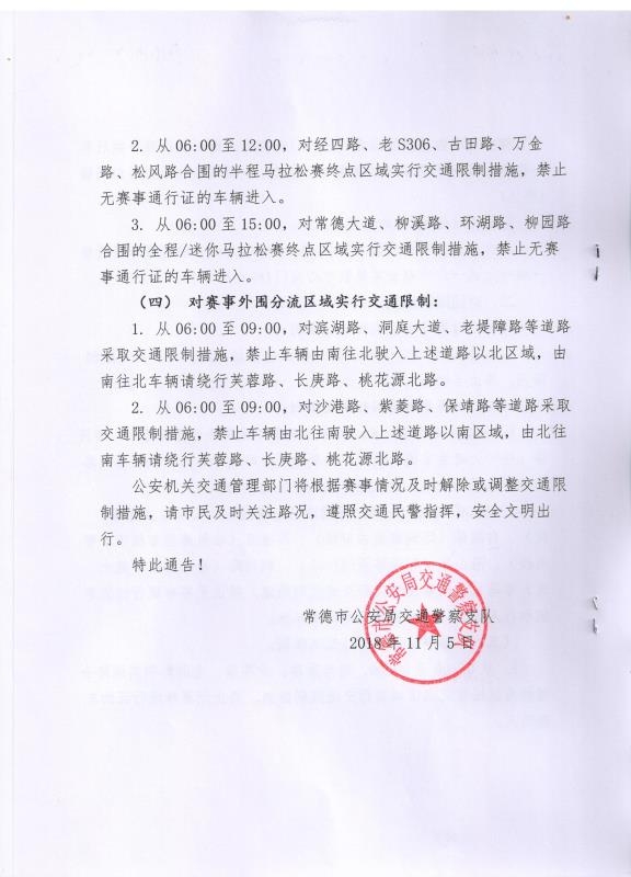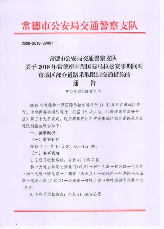 关于2018年常德柳叶湖国际马拉松赛事期间对城区部分道路采取限制交通措施的通告 发布时间:2018-11-09 10:06 信息来源:公安交警支队 【字体:小 大】 扫一扫在手机打开当前页 【打印正文】 分享到: