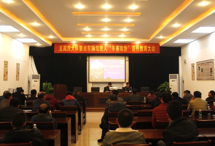 12月21日晚,常德交警直属四大队召开重点车辆驾驶人“冬春攻势”宣传教育大会,齐抓共管重点车辆安全管理,严防重特大道路交通事故。副大队长罗海,大队综合股相关人员,辖区文华、欣运、昌盛、红太阳等4家重点车辆企业负责人、驾驶人80余人参加会议。
