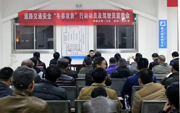 2017年12月29日晚,元旦新年假期之前,常德交警支队直属一大队派出民警深入辖区欣运集团汽车北站开展交通安全宣传教育活动,为“冬春攻势”行动营造了浓厚的宣传氛围。汽车北站场站管理相关负责人和客运车辆驾驶人等百余人参加了当晚的交通安全宣讲活动。