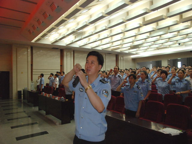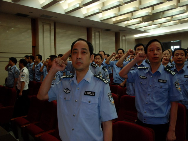 “我志愿加入中国共产党……对党忠诚,积极为党工作,为共产主义奋斗终身……”7月1日,为隆重庆祝建党90周年,市公安局机关全体党员民警,在市公安局党委委员、政治部主任彭晓林的带领下,庄严地举起右手,在鲜红的党旗下,重温我们党走过的90年光辉历程,神情庄重,朗声重温入党誓词,庄严向党承诺。此举不仅奏响了全市公安机关“创先争优党员活动日”序曲,会场上空嘹亮的“没有共产党就没有新中国”的歌声,更是抒发了每个公安民警忠于党、忠于祖国、忠于人民的赤子之心。市政府副巡视员、局长汤向荣出席并于民警一道举手宣誓和共同高歌。