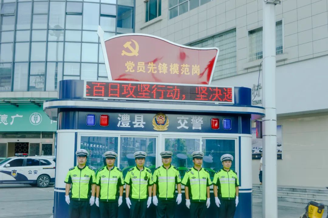 夏日的澧州,气候多变,有时火热的骄阳炙烤着路面,有时狂风骤雨席卷大地,在澧阳平原县城区北门口路口岗亭“党员示范岗”几个字特别耀眼醒目。在这里,有个优秀的小群体,他们是澧县公安局交警大队党员示范岗的交警,面对多变的夏日天气,他们时而是“浇”警、时而是“焦”警,始终坚守在自己的岗位上,指挥着川流不息的车流、人流。