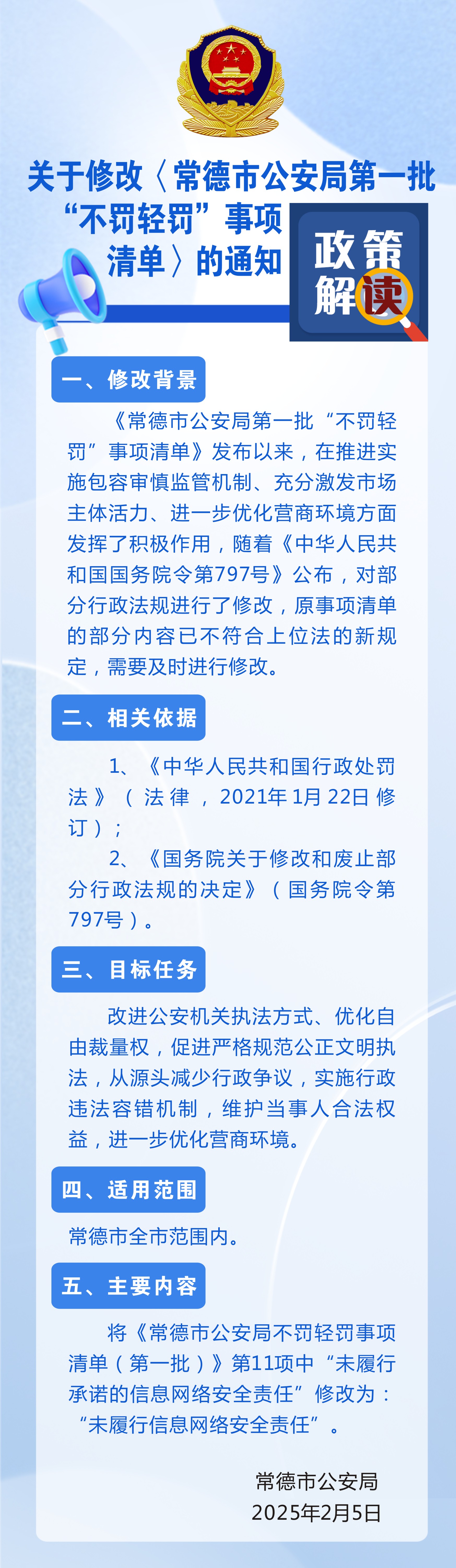将《常德市公安局不罚轻罚事项清单(第一批)》第11项中“未履行承诺的信息网络安全责任”修改为:“未履行信息网络安全责任”。