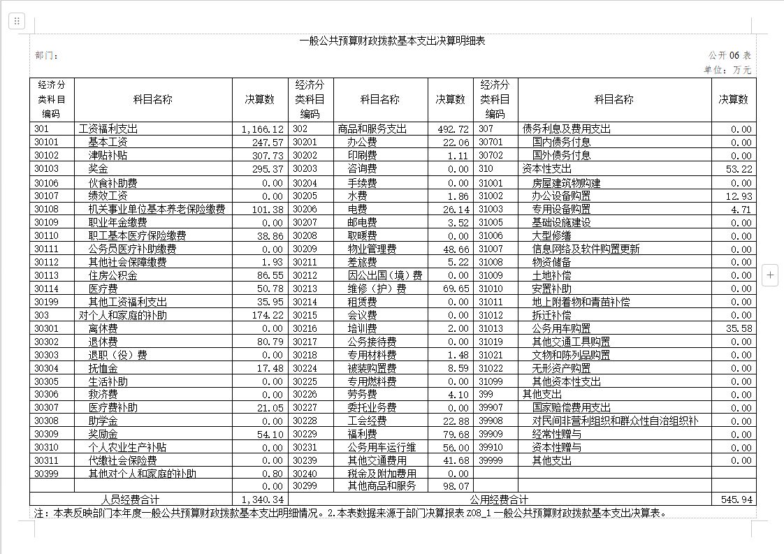 公用经费 545.94 万元,占基本支出的 29 %,主要包括办公费、印刷费、 水费、电费、邮电费、物业管理费、差旅费、维修(护)费、专用材料费、被装购置费、劳务费、工会经费、福利费、公务车运行维护费、其他交通费用、其他商品服务支出、办公设备购置、专用设备购置、 信息网络及软件购置更新、 公务用车购置、其他资本性支出。