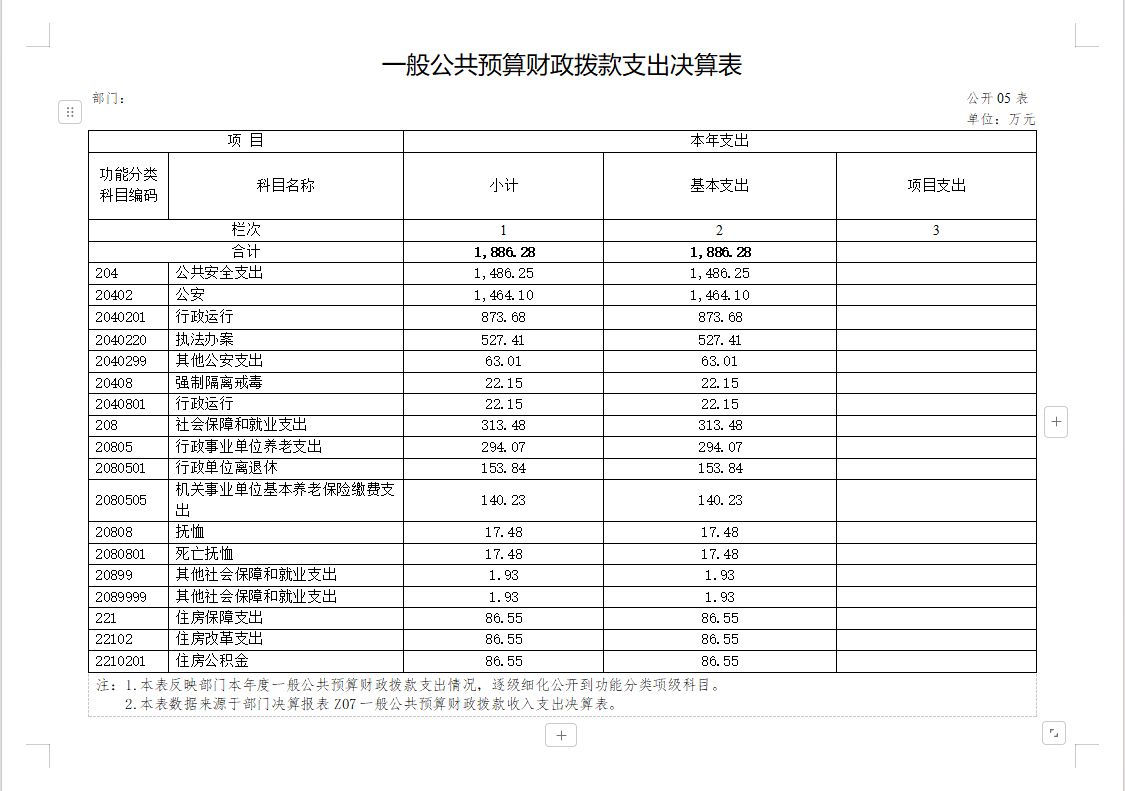 2023年度财政拨款支出 1886.28 万元,主要用于以下方面: 公共安全支出1 486.25 万元,占 79 % ;社会保障和就业支出 313.48 万元,占 17 %; 住房保障支出 86.55 万元,占 4 %。