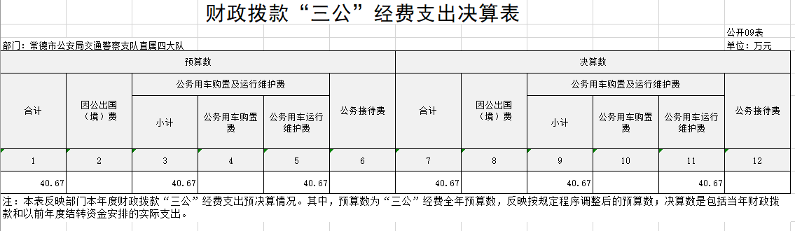 3、公务用车购置费及运行维护费支出决算为4 0 . 67 万元,其中:公务用车购置费0万元,常德市公安局交通警察支队直属四大队(单位本级或某二级机构)更新公务用车0辆。运行维护费40.67万元,主要是 公务用车买保险、车辆维修和燃油支出 等。截止2023年12月31日,我单位开支财政拨款的公务用车保有量为 9 辆。