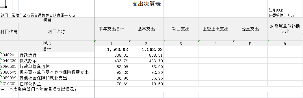 2024年度一般公共预算财政拨款支出1563.03万元,主要用于以下方面:一般公共安全支出1272.1万元,占81.39%;社会保障和就业支出212.24万元,占13.58%;住房保障支出78.69万元,占5.03%。