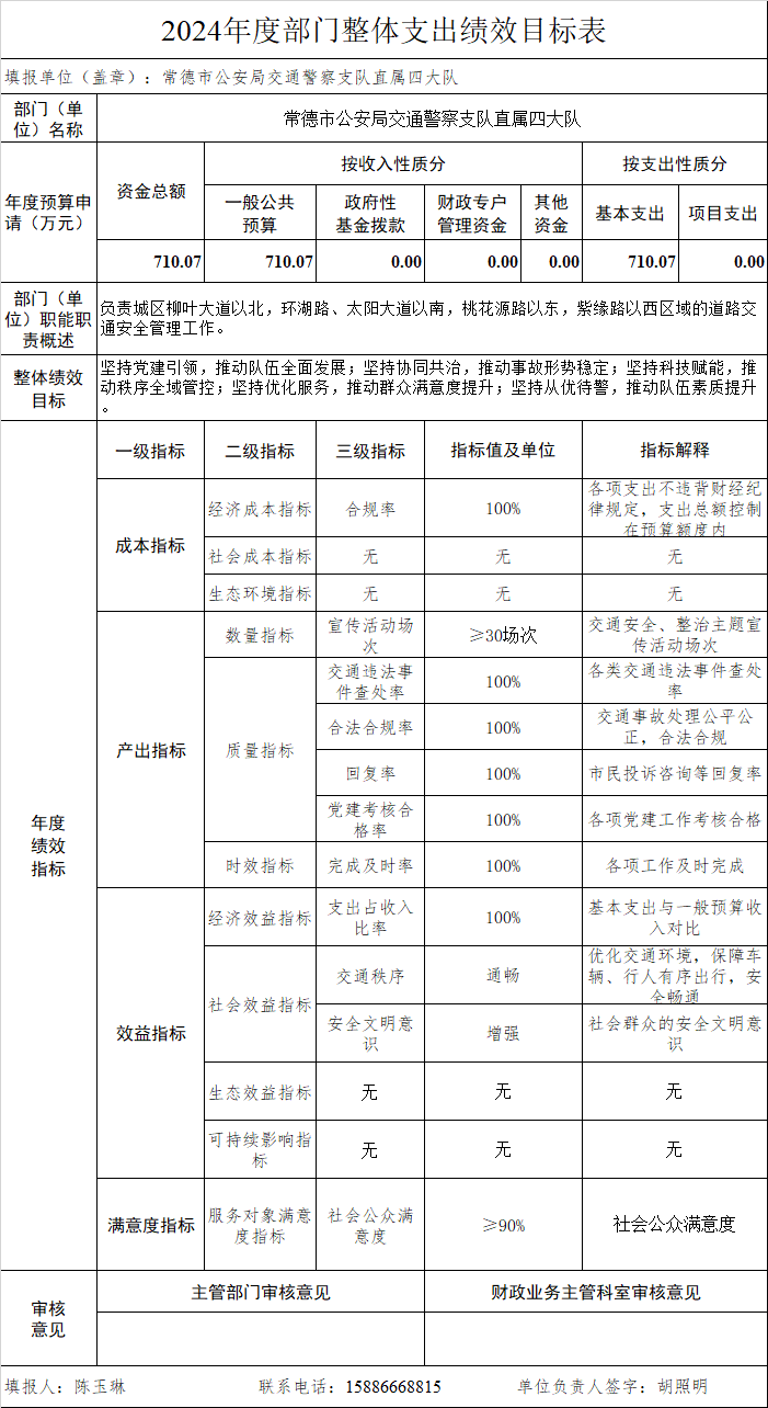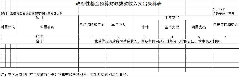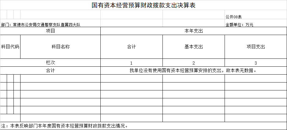 (二)决算单位构成。本单位2024年部门决算汇总公开单位构成包括:本单位无所属二、三级预算单位,故2024年部门决算编制范围为常德市公安局交通警察支队直属四大队本级。