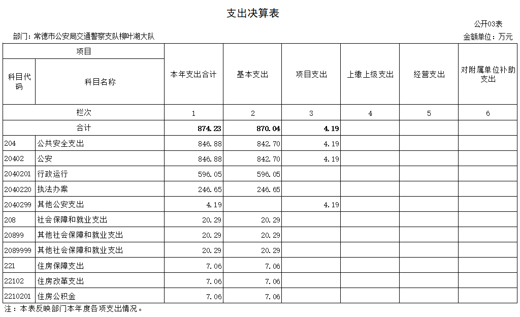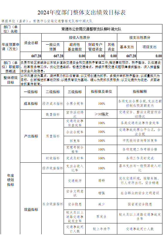 (二) 决算单位构成。常德市公安局交通警察支队柳叶湖大队 2024 年部门决算汇总公开单位构成包括:常德市公安局交通警察支队柳叶湖大队本级,共设七个部门即办公室,综合股,分控中心,路面执勤一、路面执勤二、路面执勤三中队和事故处理中队,不含下属单位或机构。大队现有在编民警 28 人。本单位无所属二、三级预算单位,故 2024 年部门决算编制范围的为常德市公安局交通警察支队柳叶湖大队本级。