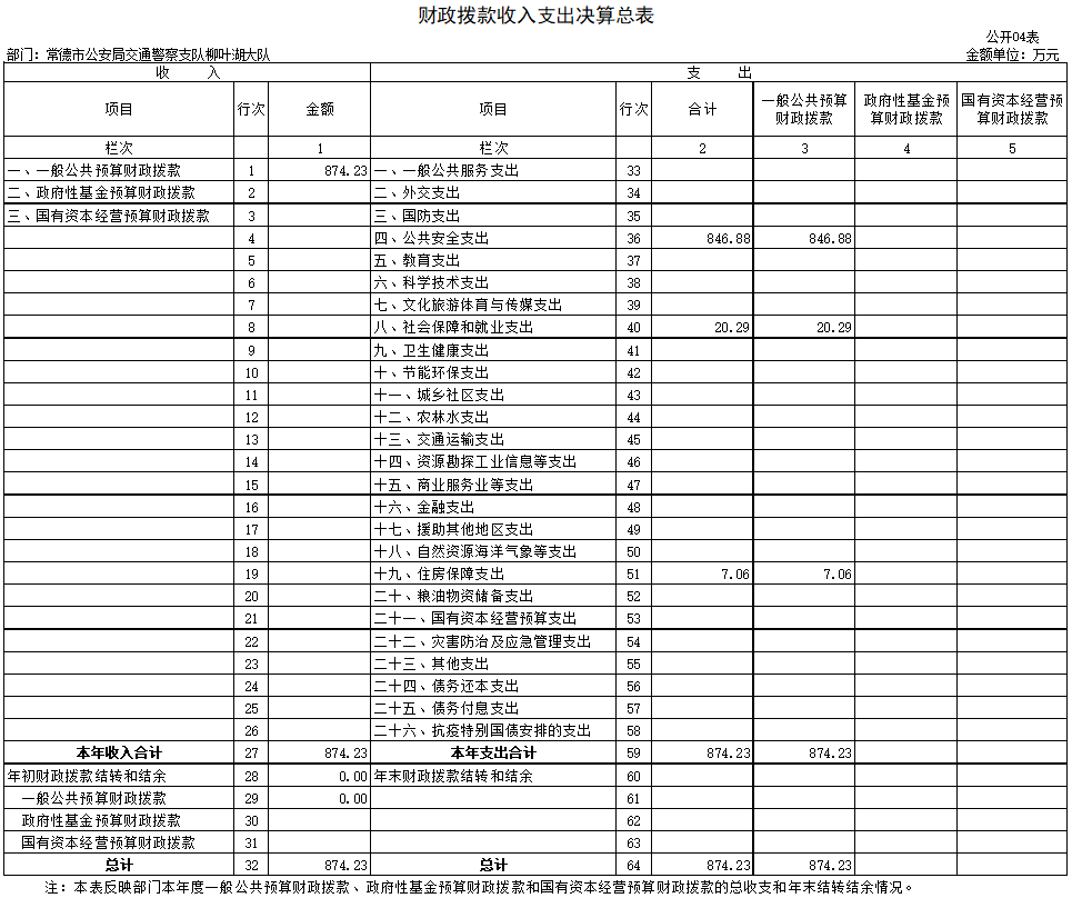 2024 年度 一般公共预算 财政拨款支出 874.23 万元,主要用于以下方面: 公共安全支出(类)支出 846.88 万元,占 96. 87 % ;社会保障和就业支出(类)支出 20.29 万元,占 2. 32 %; 住房保障支出(类)支出 7.06 万元,占 0.81 % 。
