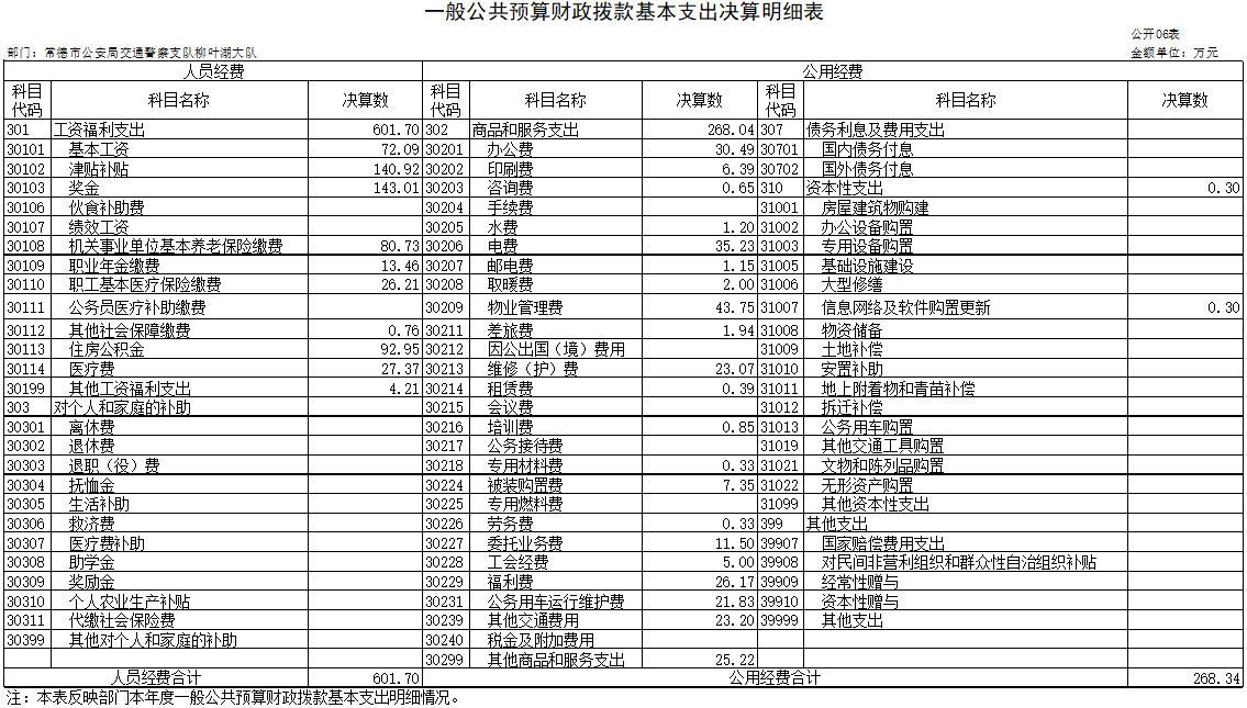 公用经费 268.34 万元, 占 基本支出的 30.84 % ,主要包括 办公费、印刷费、水费、电费、邮电费、取暖费、物业管理费、差旅费、维修(护)费、培训费、被装购置费、劳务费、工会经费、福利费、公务用车运行维护费、其他交通费用、税金及附加费用、其他商品和服务支出办公设备购置、专用设备购置、信息网络及软件购置更新、其他资本性支出。