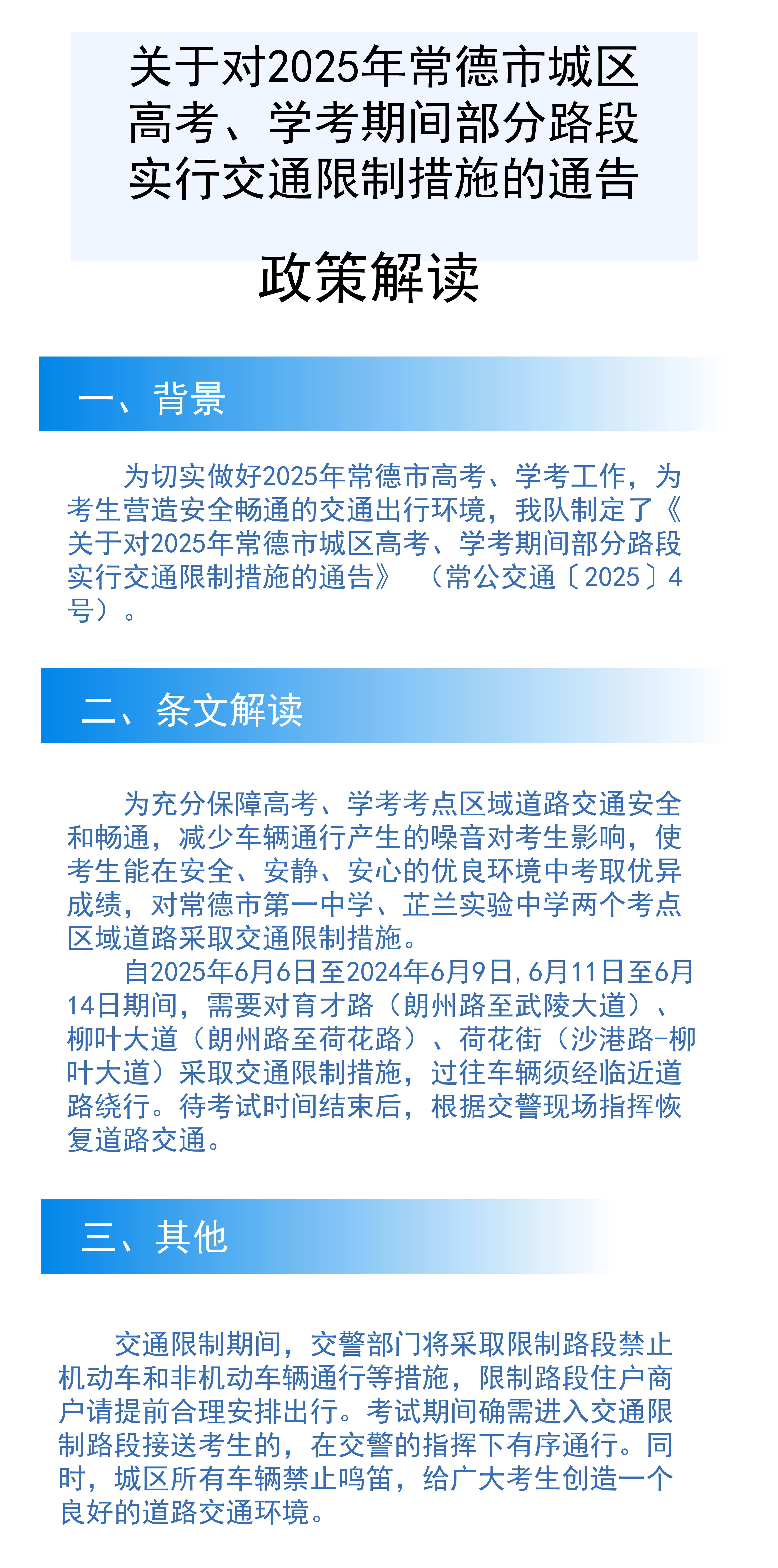 常德市公安局交通警察支队《关于对2025年常德市城区高考、学考期间部分路段实行交通限制措施的通告》的政策解读